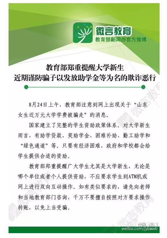8月24日上午,教育部注意到网上出现关于“山东女生近万元大学学费被骗走”的消息。教育部郑重提醒广大学生尤其是大学新生,无论是哪个单位或者个人提供资助,不应要求学生到ATM机或网上进行双向互动操作。如有类似要求的,请先向老师和当地教育部门咨询,千万不要擅自按照对方要求操作转账,以免上当受骗。