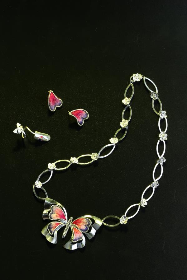 蝴蝶被人们视为吉祥美好的象征,如恋花的蝴蝶常被用于寓意甜蜜的爱情和美满的婚姻,表现了人类对至善至美的追求。首饰以白银为外轮廓,内镶刺绣红紫色渐变图案,突显出蝴蝶的艳丽色彩,展现出了